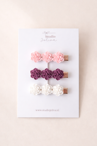 Dit prachtige setje haarspeldjes met kleine roosjes is echt een musthave uit de soft spring collectie. De combinatie van zachtroze, bordeaux en off white oassen helemaal bij de trends van nu en zijn  moeiteloos te combineren met elke outfit.