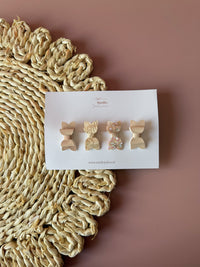 Dit setje is een prachtig samengesteld haarspeldsetje met een mix in verschillende kleurtjes strikjes. De combinatie van zachte tinten, bloemdetails en de elegante strik geeft dit setje een warme en stijlvolle uitstraling die perfect past bij de trend van nu.